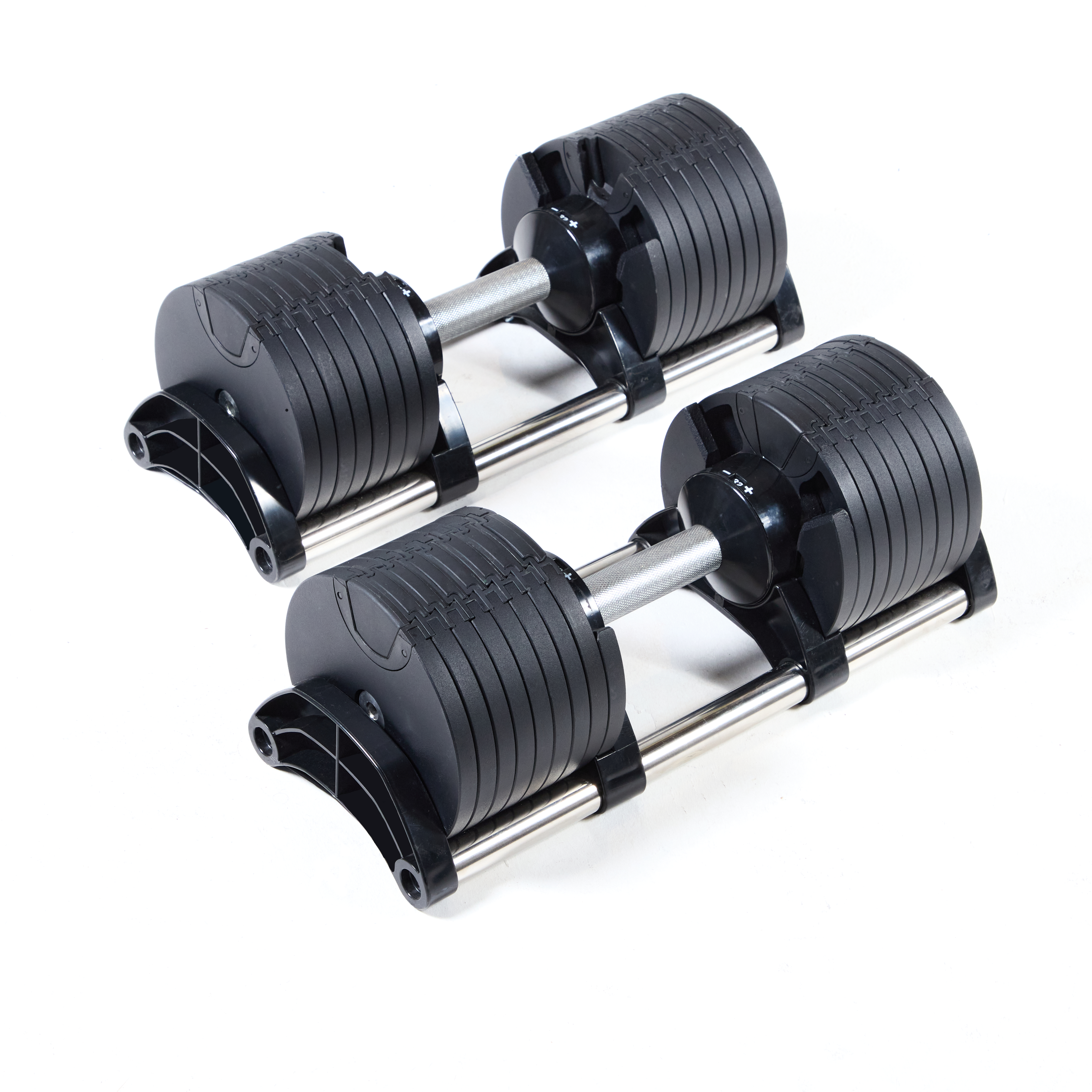 Each Smart Dumbbell adjusts from 2kg to 32kg in 2kg increments with a quick twist of the handle. Both dumbbells would give a maximum of 64kg of resistance when used together. You can use your own dumbbells if you need to progress beyond 64KG.