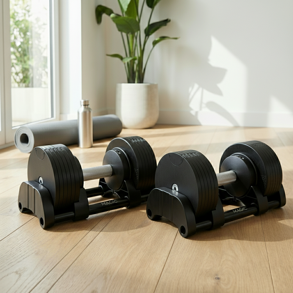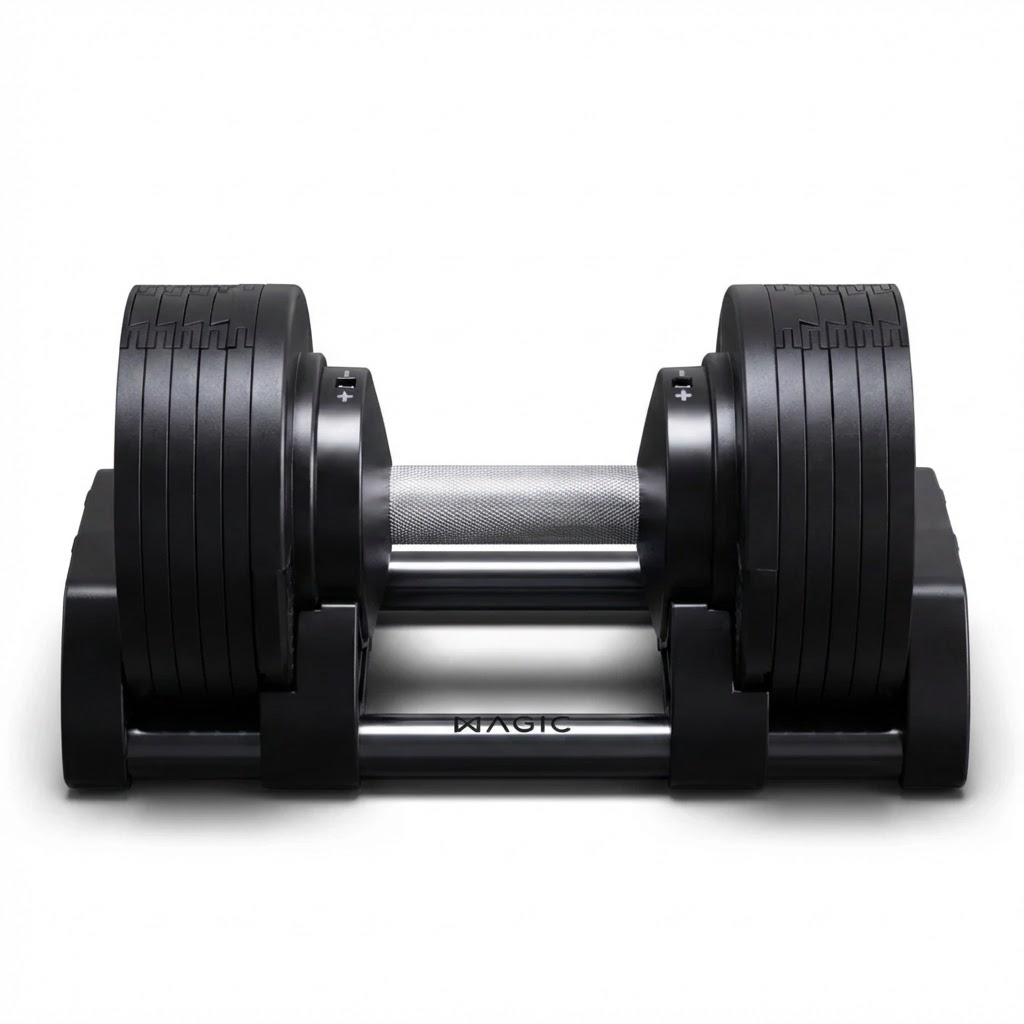 Replace an entire weight rack with a 10-in-1 weights solution. The patent-pending MAGIC smart dumbbells increase from 2KG all the way to 20kg in 2kg increments ensuring you can progress easily. Together they total 40kg of weight and are easily adjustable with a single twist of the handle.